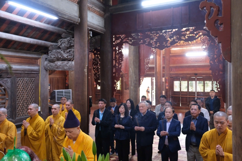 During his visit and working session at the Vietnam Buddhist Academy in Hanoi, Standing Deputy Prime Minister Nguyễn Hòa Bình and delegates visited and offered incense at the main hall of Non Nuoc Pagoda (Soc Thien Vuong Zen Monastery), praying for national peace and prosperity.